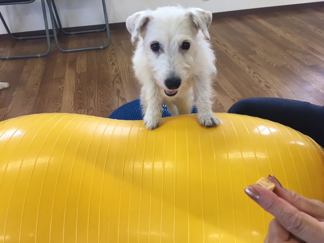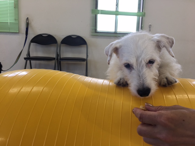シニアクラスのお友達、ジャスティンくんのバランスボールをお借りして、ご褒美のおやつをGetしようと頑張るばに婆(*^^*)
